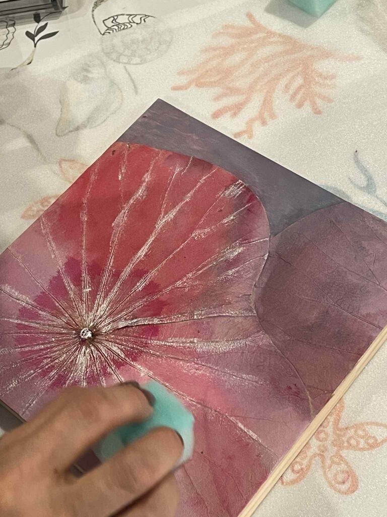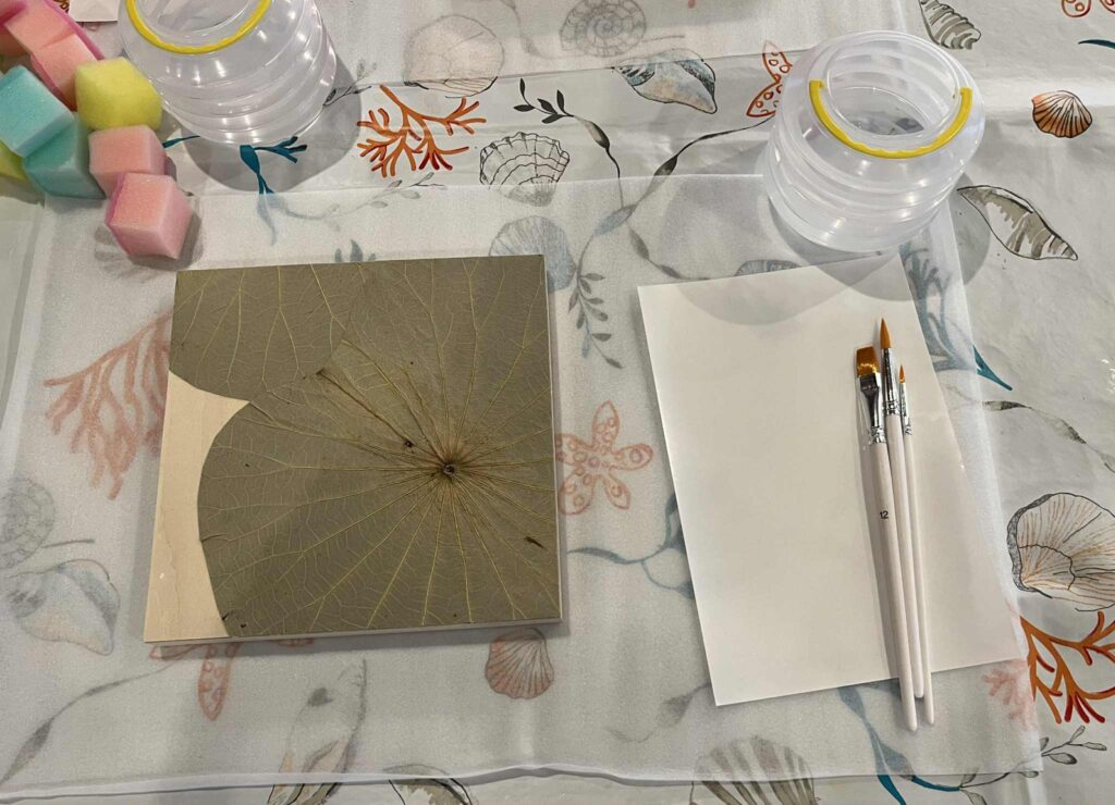 ボタニーペインティングは、本物の蓮の葉のプレートに色を付けていくアート。